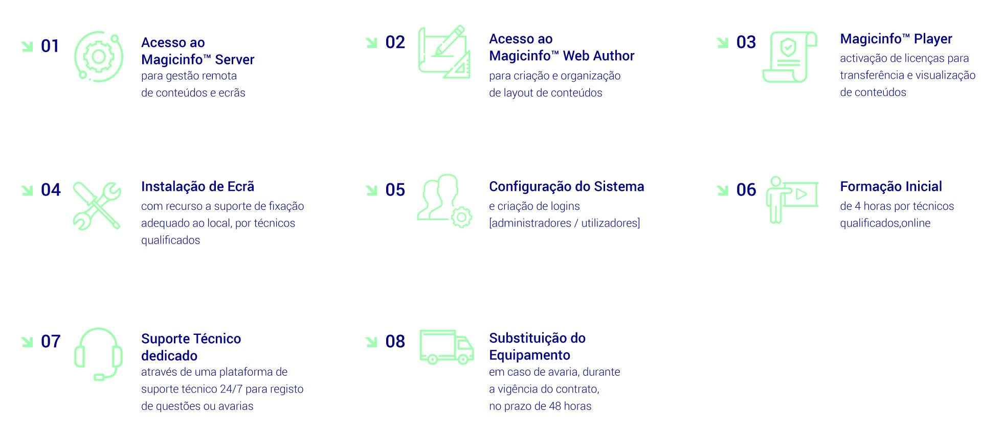 Esta solução prevê também a instalação no local por técnicos qualificados, a configuração do sistema, o acesso à plataforma de gestão remota de conteúdos MagicInfo™ da Samsung™, uma formação inicial, suporte técnico dedicado e substituição do equipamento em caso de avaria durante a vigência do contrato.